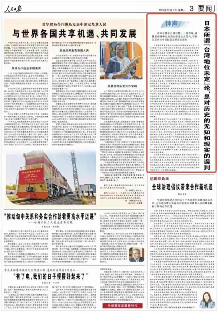 然而,高市早苗不仅发表错误言论,还搬出非法的“旧金山和约”炒作“台湾地位未定论”,这是错上加错,严重挑战战后国际秩序。